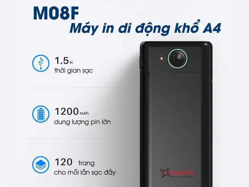 M08F với pin lithium 1200mAh được tích hợp sẵn, thời gian sạc 1.5h và in được 120 trang cho mỗi lần sạc đầy.