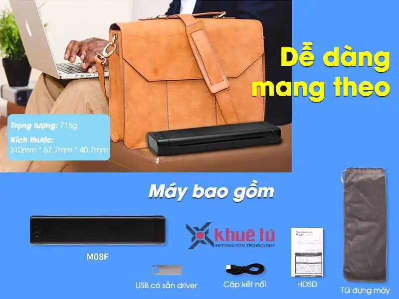 M08f với Trọng lượng: 715g / Kích thước: 310mm * 67.7mm * 40.7mm phù hợp với nhu cầu in ấn cho người thường xuyên di chuyển.