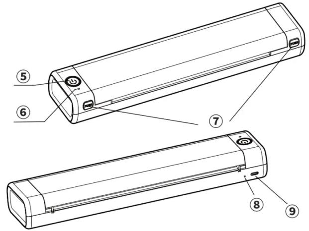 5 : Nút nguồn 6: Đèn báo 7: Chốt mở máy 8: Nút reset 9: Cổng sạc