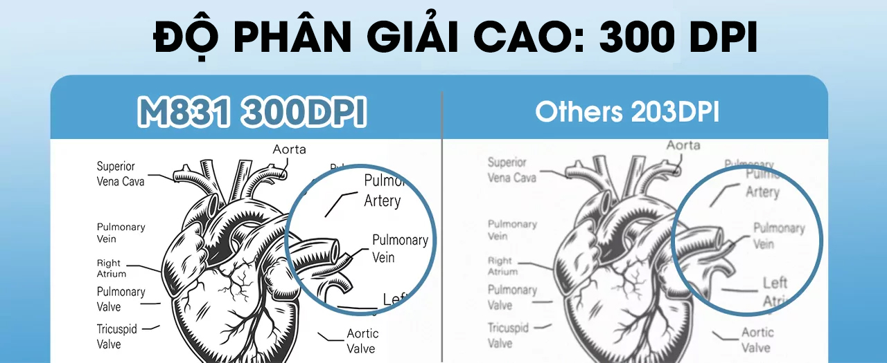 M831 được trang bị đầu in nhiệt 300dpi sẽ cho ra bản in với chất lượng rõ nét, đường nét văn bản, hình ảnh chất lượng cao nhất.