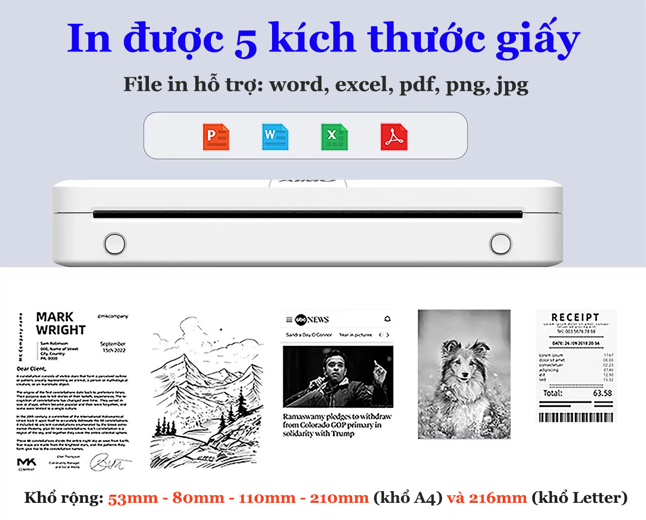 1. Hỗ trợ 5 kích thước giấy, nhiều loại file như word, excel, pdf, png, jpg .....
