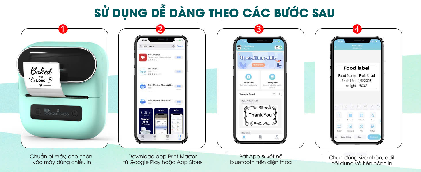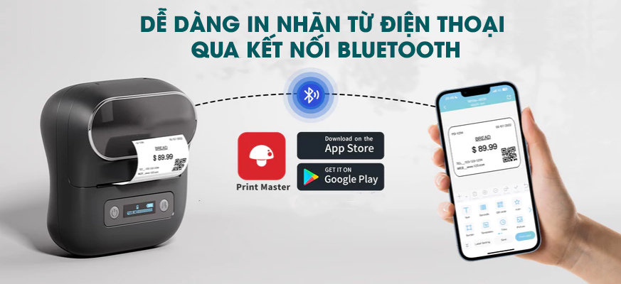 - Máy in nhãn: dạng cầm tay, in từ điện thoại thông qua app Print Master