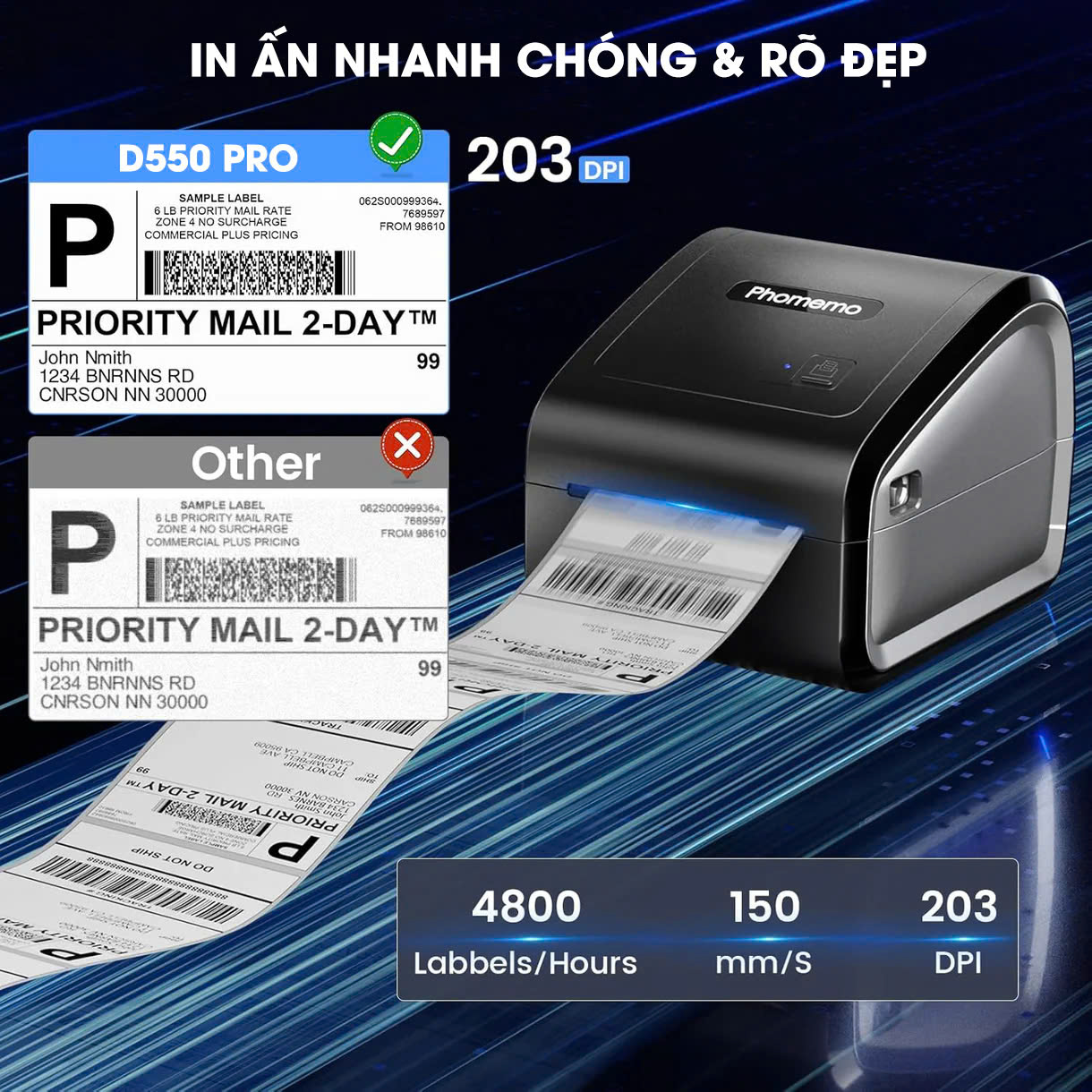 AIMO D550 PRO là dòng máy in tem nhãn/mã vạch để bàn hiện đại, được thiết kế để đáp ứng nhu cầu in ấn đa dạng như nhãn vận chuyển (Shopee, Tiki, Lazada...), nhãn kho hàng, nhãn bán lẻ, tem phụ hay nhãn siêu thị. Với công nghệ in nhiệt tiên tiến, máy không cần mực in, giúp tiết kiệm chi phí và vận hành hiệu quả.