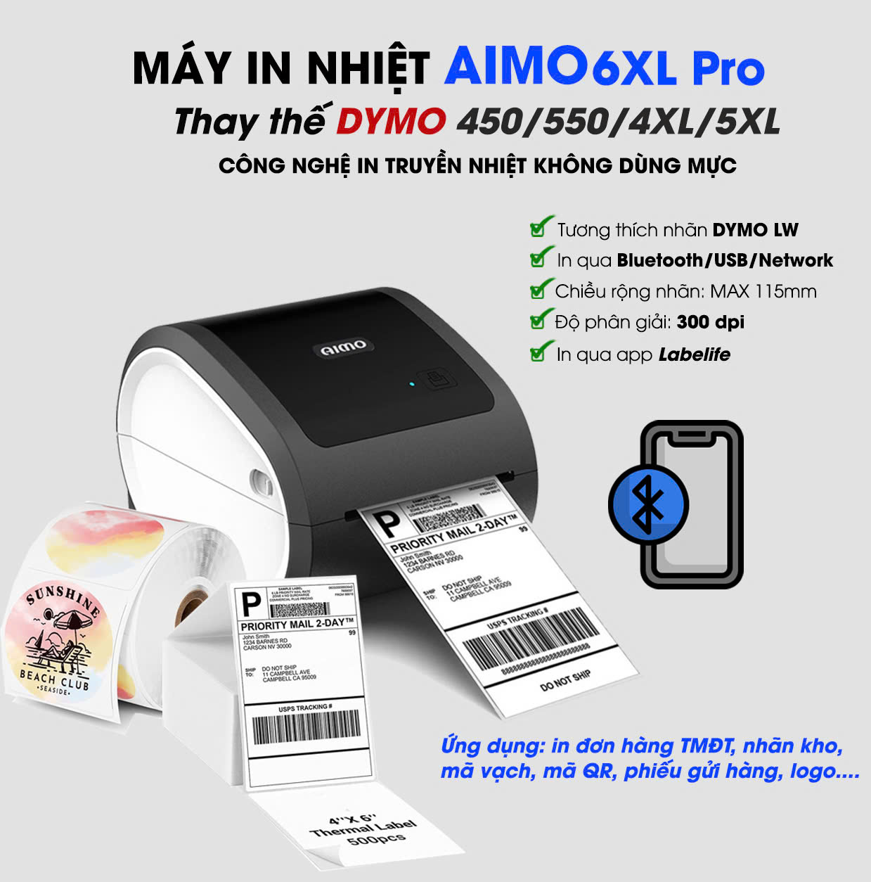 Máy in nhãn AIMO 6XL Pro là giải pháp lý tưởng thay thế cho máy in DYMO 450, 450 Turbo, 550, 550 Turbo, 4XL, 5XL không còn cung câp chính hãng tại Việt Nam. Tương thích toàn bộ nhãn DYMO, máy in tem Shopee, mã vạch, tem phụ sắc nét với độ phân giải 300dpi và kết nối Bluetooth, đáp ứng mọi nhu cầu in ấn.