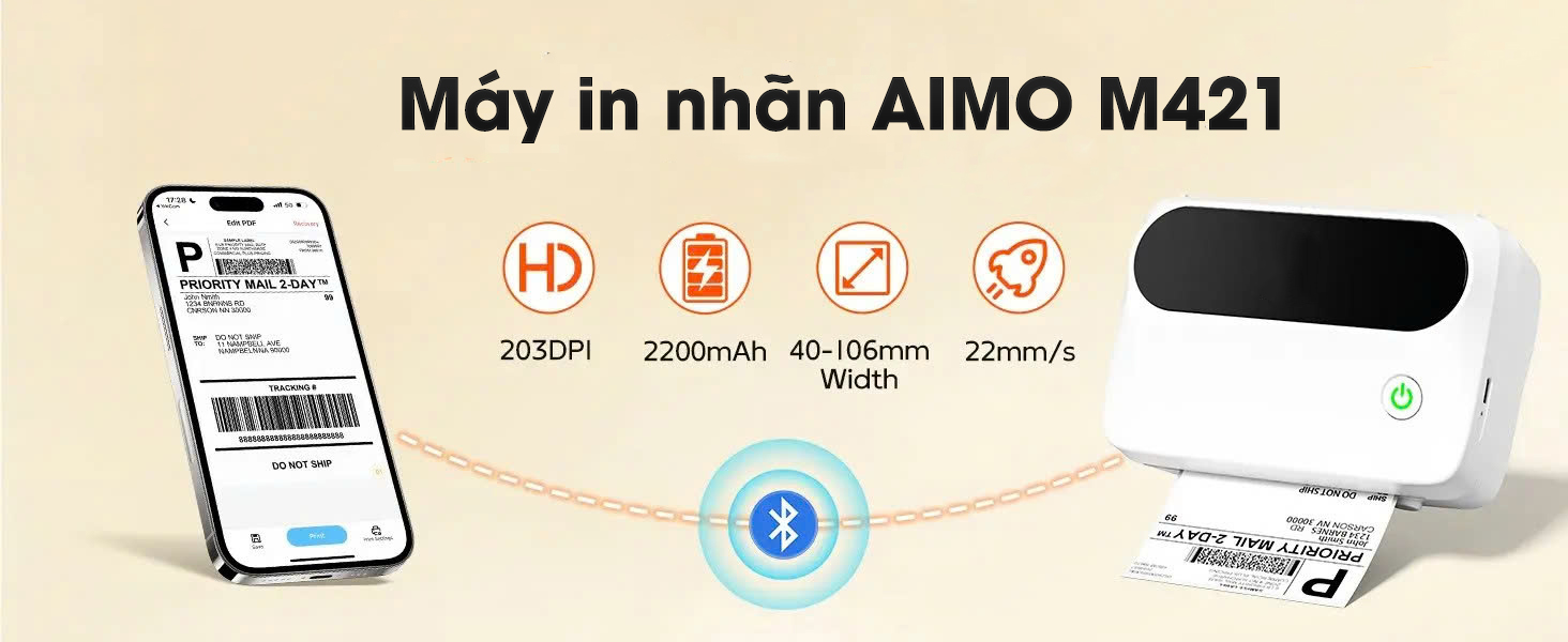 Máy in nhãn AIMO M421 là giải pháp in tem nhãn nhanh chóng, tiện lợi dành cho các shop kinh doanh nhỏ, cửa hàng trang sức, đồ handmade, mỹ phẩm và thực phẩm đóng gói. Với công nghệ in nhiệt trực tiếp, không cần mực, máy giúp tiết kiệm chi phí mà vẫn đảm bảo chất lượng in sắc nét. Hỗ trợ kết nối Bluetooth, người dùng dễ dàng thiết kế và in tem ngay từ điện thoại. Thiết kế nhỏ gọn, linh hoạt, phù hợp để in nhãn giá, mã vạch, logo thương hiệu hay thông tin sản phẩm, giúp cửa hàng chuyên nghiệp và đẹp mắt hơn.