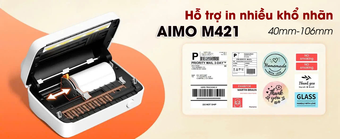 🔹 AIMO M421 có thể in nhãn từ 40mm đến 106mm, phù hợp với nhiều loại sản phẩm:
