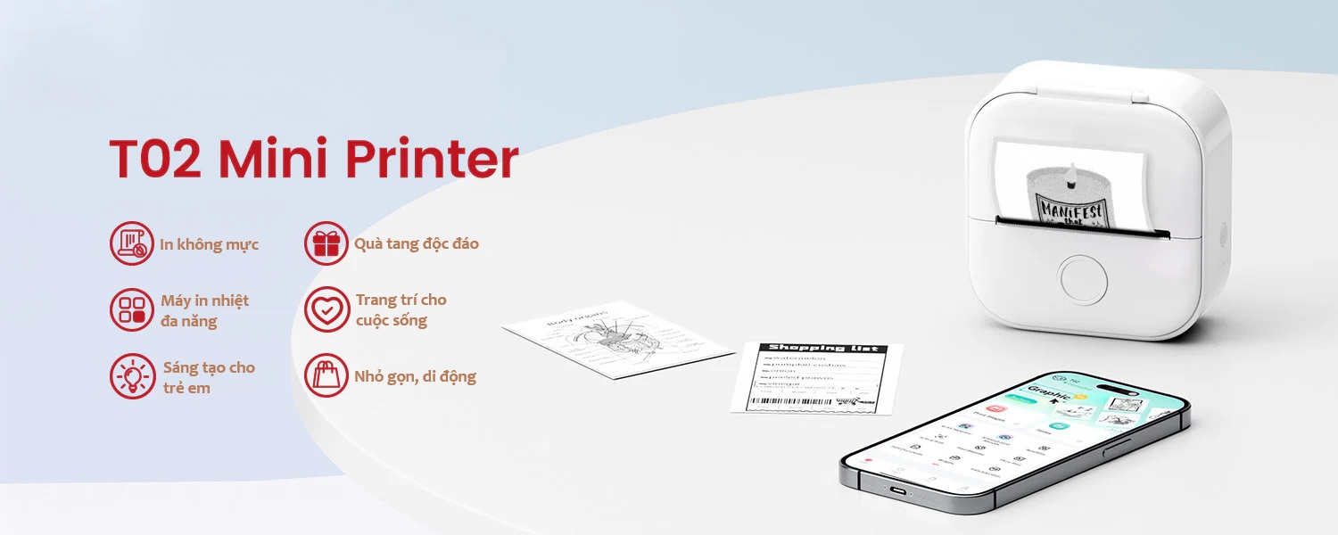 Máy in nhãn mini T02, Bluetooth, in không mực