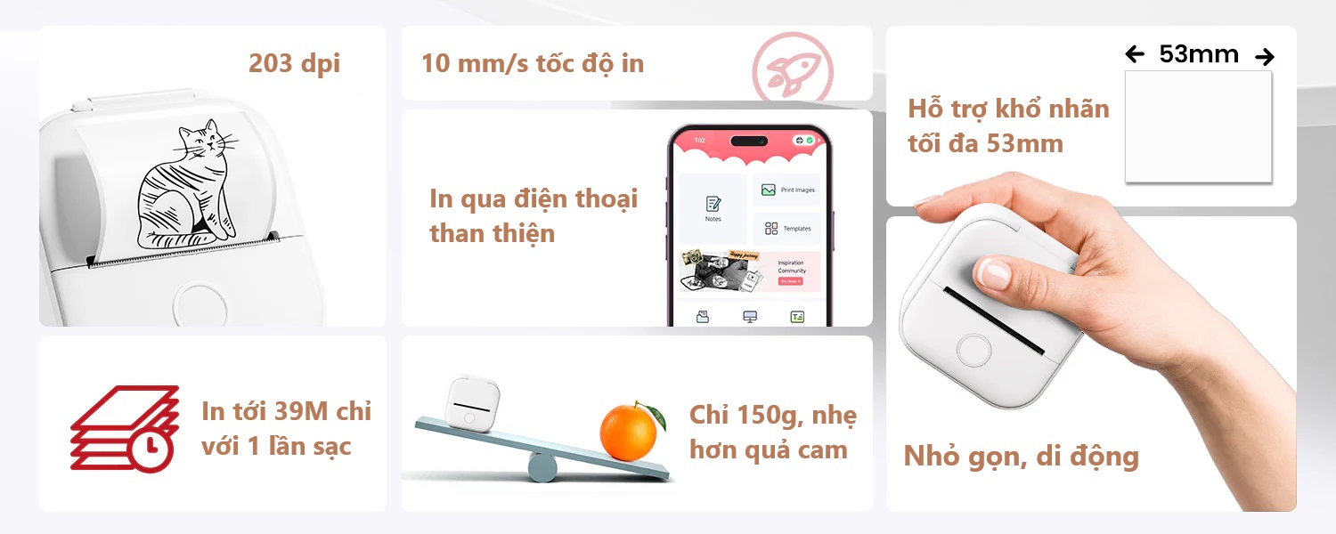 Kích thước 87 * 90 * 40mm và nặng chỉ 150g, Máy in nhãn mini T02 nhẹ hơn 1 quả cam sẽ cho phép bạn in mọi lúc, mọi nơi.