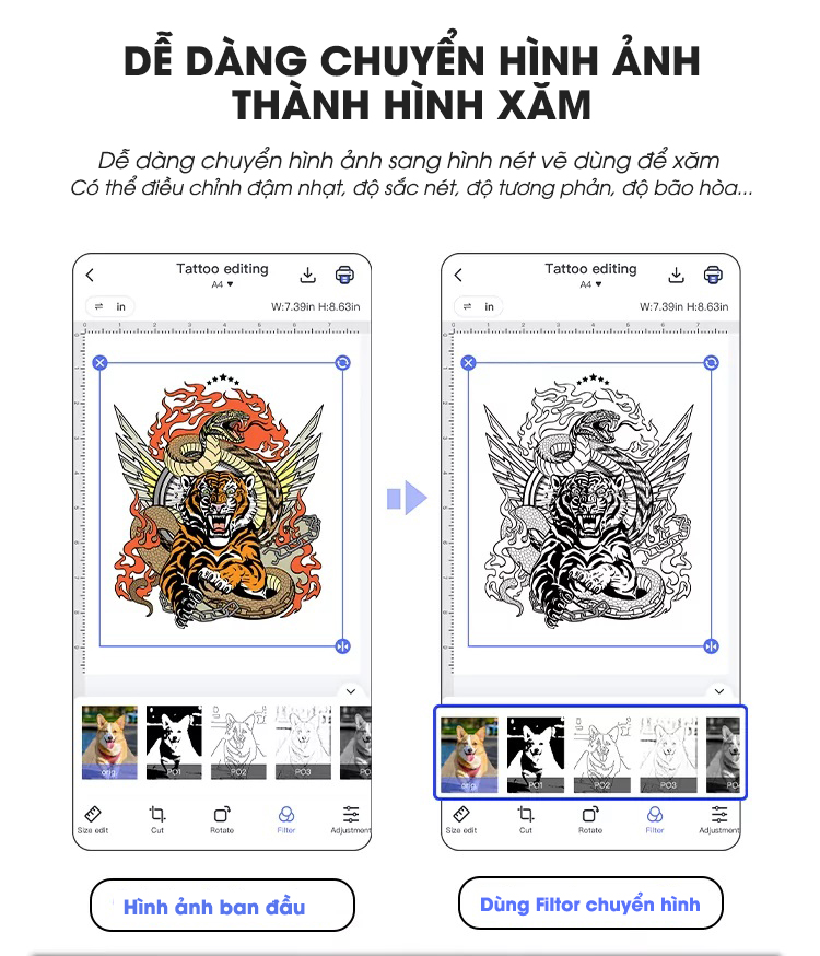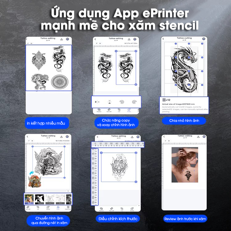 Thêm chức năng cắt hình ảnh để in khuôn hình xăm lớn, có thể in và sao chép thiết kế hình xăm lớn của bạn lên da một cách hoàn hảo mà không gặp lỗi.