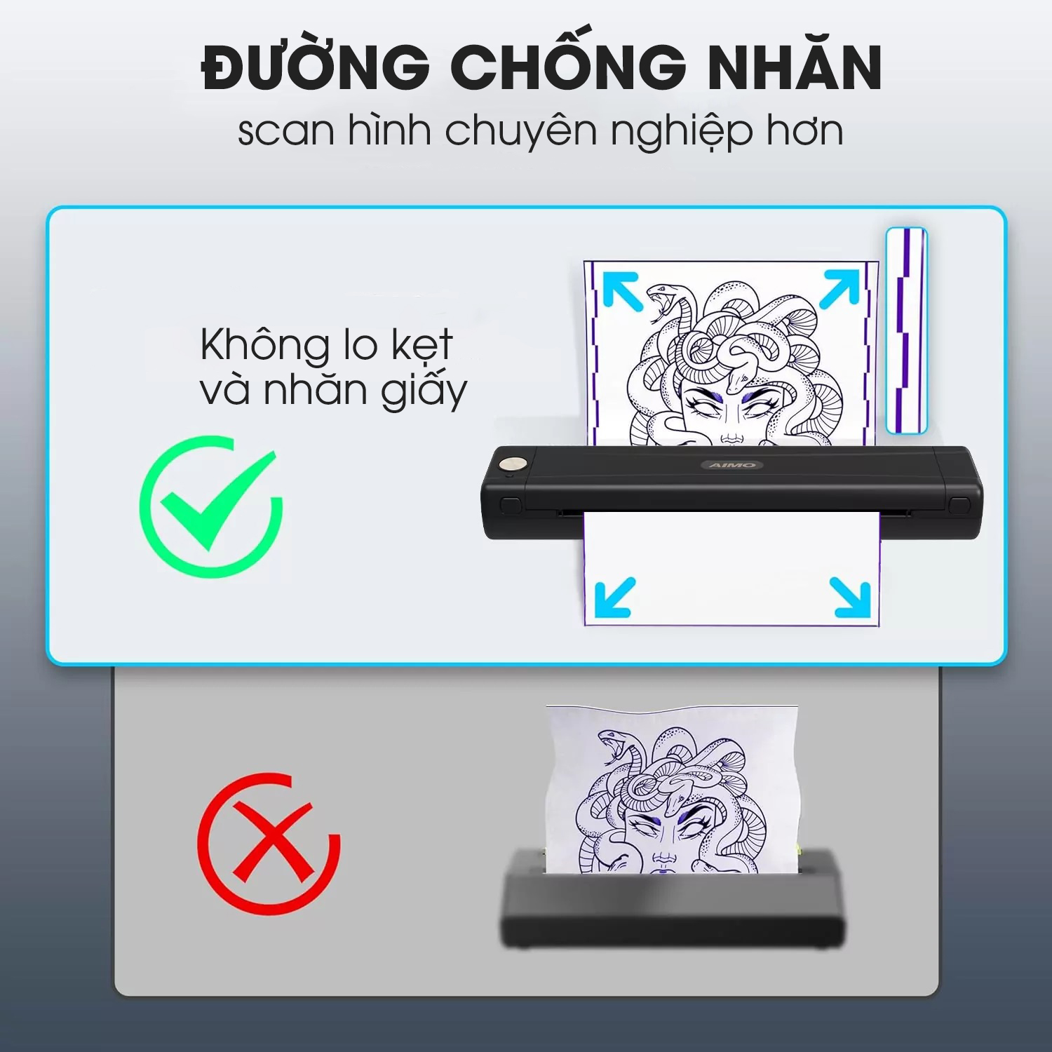 Máy scan hình xăm AIMO M08E-WS được trang bị chức năng chống nhăn mới, giúp tránh xa các vết nhăn và kẹt giấy. Không gặp vấn đề tắc mực hay vệ sinh thường xuyên. Giúp việc in khuôn hình trơn tru hơn, loại bỏ vấn đề kẹt giấy và nhăn, giảm lãng phí giấy hình xăm.