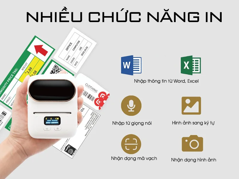 Nhiều chức năng in như: in từ cơ sở dữ liệu excel, giọng nói thành ký tự, nhận dạng mã vạch